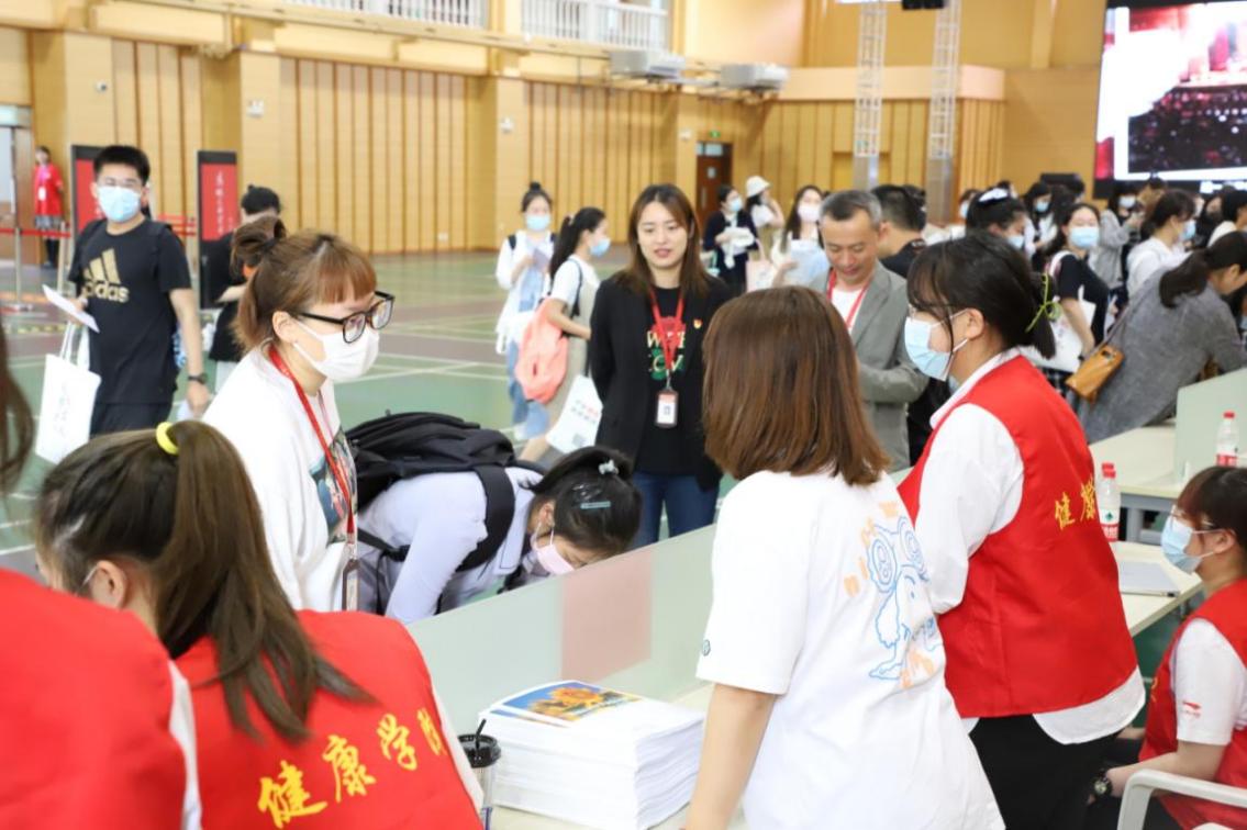 早上7:30,班助理团队在体育馆进行新生报到准备工作的最后确认,怀揣着激动的心情等待着2021级春季新生们的到来。早上9:00,2021级春季新生们陆续地来到校园报到。体育馆外的人头攒动,井然有序地排着队进入。志愿者们热心地向正在等待的学生和家长们介绍校园。馆内,班助理带领学生们在指定的摊位进行新生报到工作并领取暑期作业,同时组织了新生共同观看学校宣传片。