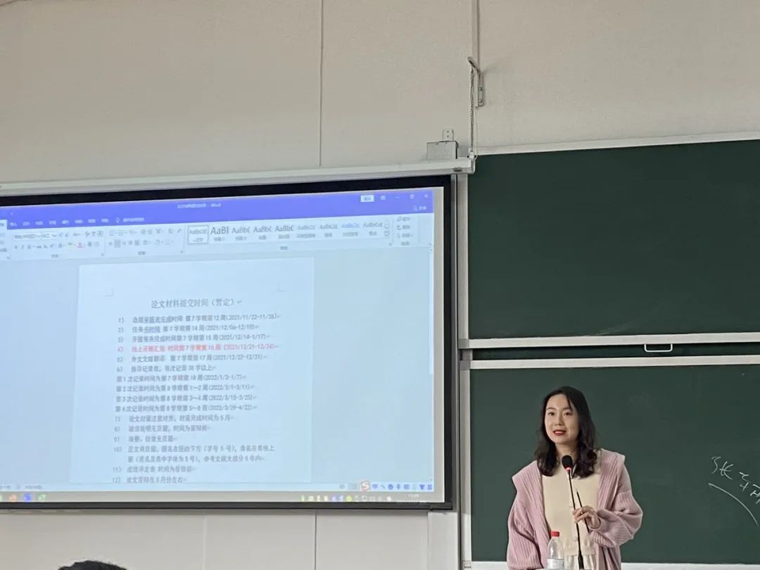 随后,王珊老师进行了论文方面的指导,给大家列举出了往年的问题,希望各位大四同学积极配合学校及导师的工作,能够及时与导师联系,多沟通多交流,圆满地完成毕业前的最后一项任务。