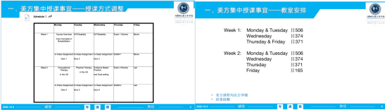 会上,首先由徐欣老师强调本学期美方课程的重要性以及学分绩点相关事宜,并叮嘱同学们提前熟悉Blackboard学习系统,如有问题及时向助教老师反馈。接着,孟赛老师向在座的所有同学讲解了如何登录Blackboard系统以及如何查看课程信息,并强调了RSC200 Foundations of Rehabilitation Science这门课程的教学大纲和进度、评分标准、授课时间与教室安排,提醒同学们不要走错教室,按时完成教授布置的作业,认真做好预习和复习工作,此外还针对最后一天的实验课进行了分组。最后,孟赛老师让同学们相互之间进行交流学习Blackboard系统的使用方法,并对有问题的同学进行了答疑解惑。