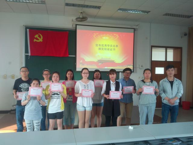 在庄严的国歌声中,结业典礼正式开始,学院党总支副书记周建光老师宣读了优秀学员名单并颁发了优秀学员奖状。有4名优秀学员代表上台发言,同学们经过了一个月的中党学习,加强了对入党的基本认识,明确了入党步骤,树立了正确而坚定地政治方向。