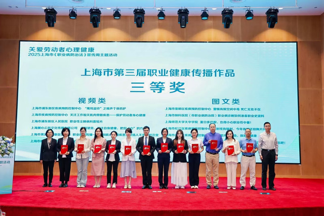 为深入宣传贯彻《健康中国行动(2019-2030年)》和《国家职业病防治规划(2021-2025年)》精神,加强职业健康领域科普与宣教,进一步普及职业健康知识,提升劳动者职业健康素养,根据《国家卫生健康委办公厅 中华全国总工会办公厅关于举办第三届职业健康传播作品征集活动的通知》要求,上海市卫生健康委员会等相关组织开展了第三届职业健康传播作品征集活动。4月24日,市卫生健康委联合市民政局、市人力资源社会保障局、市医保局、市疾控局、市总工会共同举办的上海市《职业病防治法》 宣传周活动在上海市疾病预防控制中心顺利举行。活动现场对上海市第三届职业健康传播作品征集活动优秀作品进行了颁奖。
