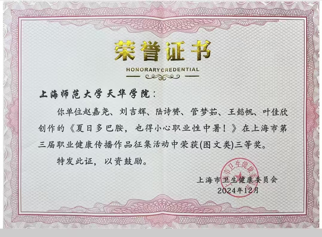 《夏日多巴胺,也得小心职业性中暑!》——赵嘉尧、刘吉辉、陆诗赟、管梦茹、王懿帆、叶佳欣该作品用通俗易懂的文字和图片,从排版和内容方面大胆创新。从概念、分类及症状等多个方面入手详细介绍了职业性中暑以及后续影响,简明扼要,更贴近实际生活和健康需求地普及有关职业性中暑的相关内容。