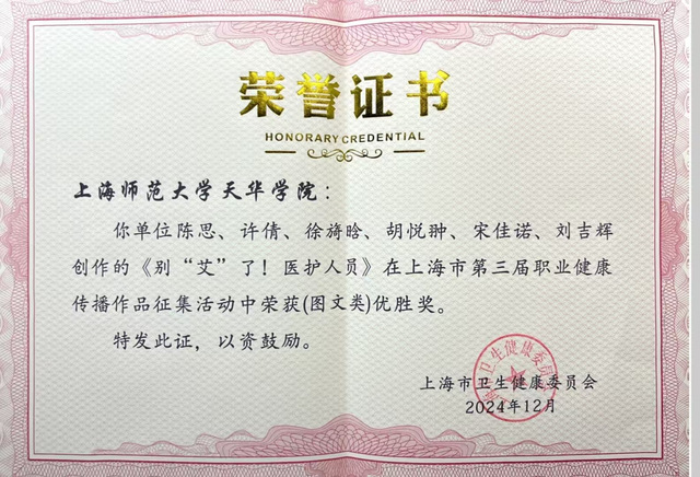 本次活动中,我院报送的作品《夏日多巴胺,也得小心职业性中暑!》和《别艾了!医护人员》通过了初步形式审查、一轮专家打分评选、二轮专家评审会终审等程序,在众多优秀作品中脱颖而出,分别荣获图文类三等奖、图文类优胜奖。同时,因我院在活动中表现突出,我校荣获组织贡献单位的荣誉。