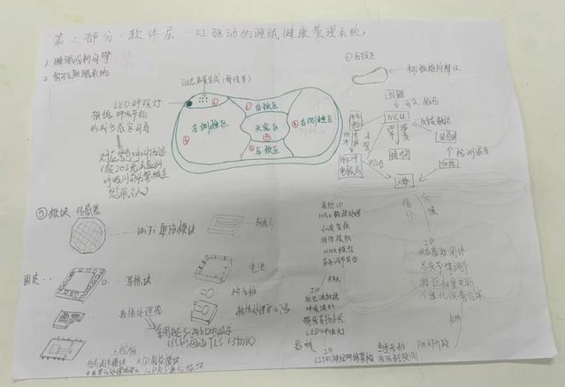 在探索人本主义健康课程的过程中,我们还构想了一款名为“眠之翼”的智能枕头。这个创新产品融合了多模态传感器(生物传感器、毫米波雷达、体位感知阵列)与动态支撑系统(分舱气室、记忆棉、钛合金龙骨),实现了精准睡眠监测与自适应舒适调节。依托 AI 驱动的健康管理系统,它能够提供个性化助眠方案与多维度数据分析,构建无缝健康生态,联动医疗资源与智能家居。同时,通过医疗级加密、匿名化处理及区块链技术,全面保障用户隐私与数据安全。