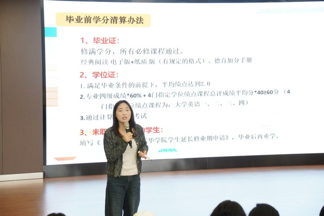 刘卫卫老师首先对毕业生普遍关心的毕业学位条件、毕业生登记表与四联单填写要求、7种就业、签约形式等内容进行全面解读,她重点强调毕业学位取得条件细则及毕业前需提交的各项材料要求,提醒同学们高度关注绩点、四级成绩以确保顺利毕业;同时她对相关毕业材料的填写规范进行细致指导,为毕业生们在迈向人生新阶段的关键节点上,打下坚实基础。其次讲述就业指导与职业规划,为毕业生搭建起从校园到职场的“桥梁”,她围绕就业指导核心内容、结合当前就业市场趋势,为同学们分析不同行业的岗位需求与职业发展路径,鼓励大家积极把握招聘会等就业契机,在主动沟通与实践中找到契合自身发展的职业岗位。