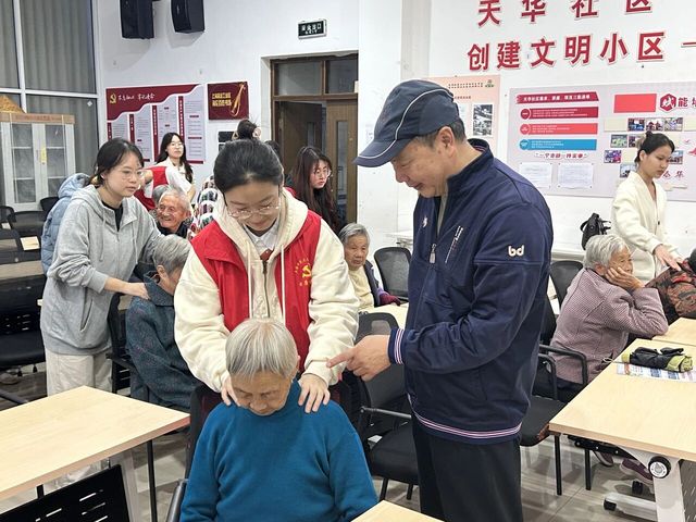 负责按摩的同学则运用服务型党组织专项培训中习得的 “拿、捏、揉” 等专业推拿手法,结合居民肩颈、腰背等常见不适部位,提供个性化按摩服务。同学们专注细致的操作赢得居民一致好评,大家纷纷表示按摩力度适中,有效缓解了长期积累的肌肉酸痛与不适感。