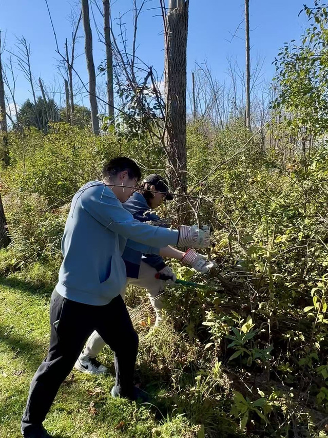 (课外实践活动剪影:作为课程的一部分,同学们在校园后山参与剪除沙棘树的志愿服务,从新的角度理解人与环境的互动)