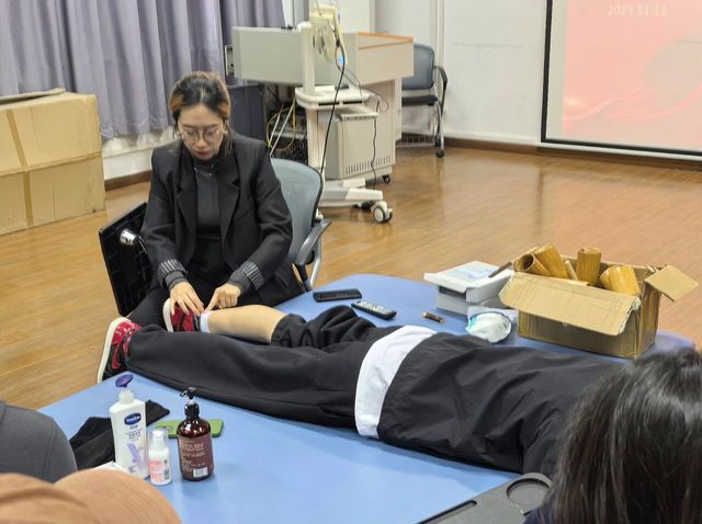 培训内容引入了拔火罐操作与筋膜枪使用两项在现代保健中应用广泛的技术。张荣健教授首先详细讲解了拔火罐的基本原理、适用情况、操作流程及安全规范,尤其强调了防火安全与禁忌症识别。在筋膜枪使用环节,王苏蒙老师则重点指导了如何针对不同肌肉群选择适宜按摩头、使用角度、力度控制及使用时长,避免不当操作可能带来的损伤。