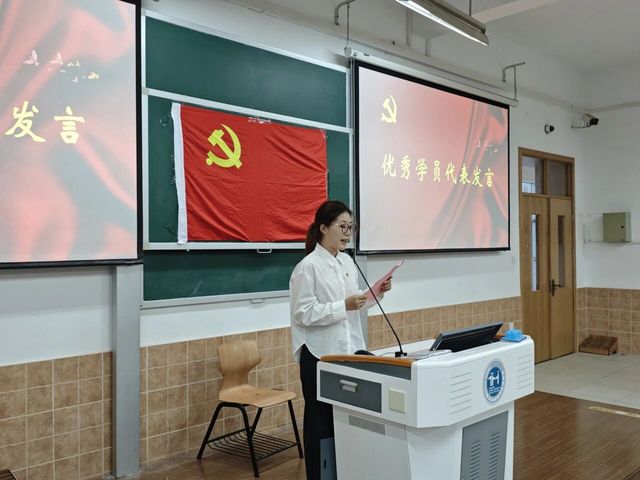 在代表发言环节,来自24级康复治疗学(中外合作办学)3班的张研同学作为优秀学员代表发言。她结合自己主动参与无偿献血并投身志愿服务的经历,动情地讲述了对“全心全意为人民服务”宗旨从理论认知到切身体会的深刻转变。她表示,将把在党校的收获转化为未来学习、工作和生活的强大动力,在思想上和行动上持续向党组织靠拢,夯实专业基础,练就过硬本领。她的发言真挚朴实,充满了实践后的深刻感悟和坚定的决心。