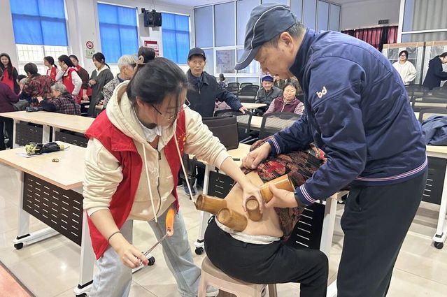 负责按摩的同学则运用服务型党组织专项培训中习得的 “拿、捏、揉” 等专业推拿手法,结合居民肩颈、腰背等常见不适部位,提供个性化按摩服务。同学们专注细致的操作赢得居民一致好评,大家纷纷表示按摩力度适中,有效缓解了长期积累的肌肉酸痛与不适感。