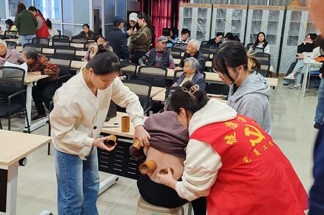 拔火罐服务则针对湿气较重的居民,在张荣健教授的全程指导下,同学们严格遵循操作规范,重点针对肩背、腰等肌肉丰厚部位,通过留罐技法帮助居民疏通经络、散寒除湿,有效缓解了关节酸痛、肢体沉重等不适。