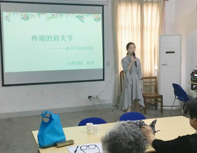 本次讲座主要介绍了关于肩关节活动受限中肩周炎的康复训练,通过向社区居民进行康复宣教、阐述肩周炎的主要症状、教导社区居民进行一系列的运动康复训练和日常生活活动注意事项等方式,使社区居民对于肩周炎的康复有了初步的了解。