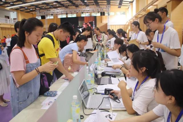 体育馆内,新生报到处也是热火朝天,我院班助理团队于报到处负责收集新生入学材料、解决初到校园时遇到的各类困难,井然有序地运转着新生报到工作。