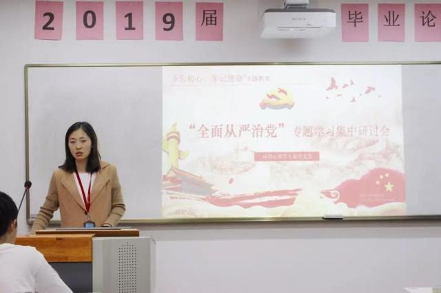 根据上级党委的要求,突出8个专题的教育工作,应用心理学专业党支部于10月9日,在天华楼360召开了“全面从严治党”专题学习集中研讨会。参加人员:应用心理学专业党支部陈翠翠、杨宇然、刘卫卫、徐红娟等党员老师以及全体应用心理学专业积极分子。