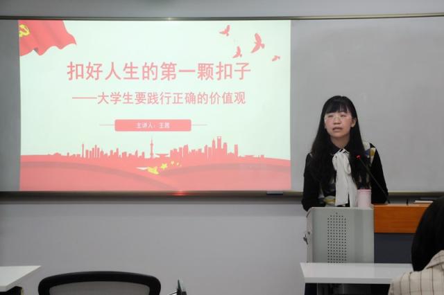 随后,王老师告诫大家在大是大非面前要做出正确的选择,这也是大学生是否能真正践行核心价值观的评判标准,并且重点剖析解读了习总书记对大学生的“八字要求”:勤学、修德、明辨、笃行,告诫大家要有明辨是非的能力和笃实的心态,要有品德的滋养和引导,踏踏实实做事才能成为梦想的缔造者。