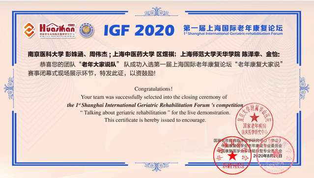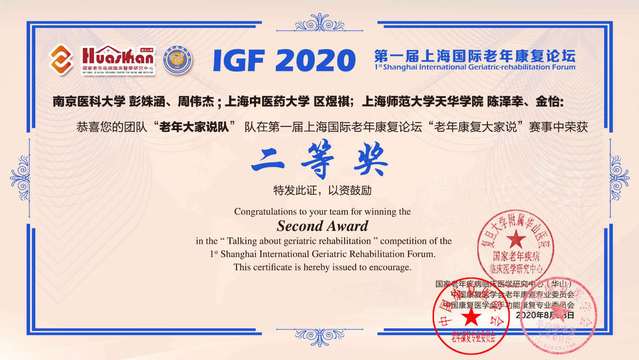 “老年大家说队”荣获IGF2020第一届上海国际老年康复论坛“老年康复大家说”竞赛全国二等奖。
